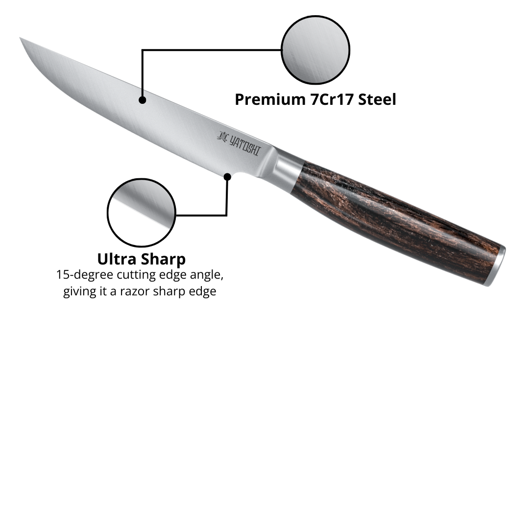 Our knife sets are crafted from premium high-carbon steel (7Cr17), delivering razor-sharp precision and professional-level quality right in your kitchen. With 0.6–0.75% carbon content, these blades are twice as tough as typical kitchen knives, ensuring lasting strength and reliability.