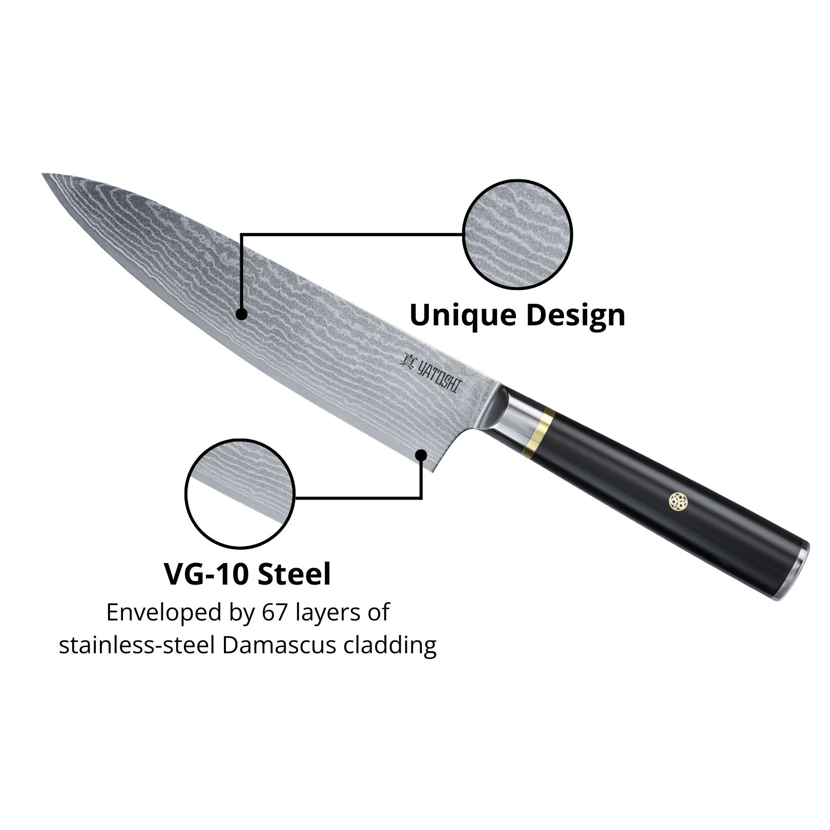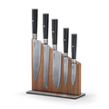 This knife set combines premium craftsmanship with modern functionality. Each blade features a VG-10 cutting core surrounded by 67 layers of stainless-steel Damascus cladding, delivering exceptional sharpness, edge retention, and durability. With a Rockwell Hardness of 60–61 and a meticulously hand-shaped Japanese double-bevel angled at 16° per side, the knives offer precise, effortless cutting performance. The G10 handles, crafted from a textured fiberglass composite, feature a concealed-tang design that balances strength, comfort, and contemporary style, while also being low-maintenance and moisture-resistant. The set is housed in a sleek walnut wood magnetic block, lined with powerful magnets to securely organize and display each knife. Finished with a non-slip base, the block’s clean, minimalist design brings both elegance and stability to any kitchen.