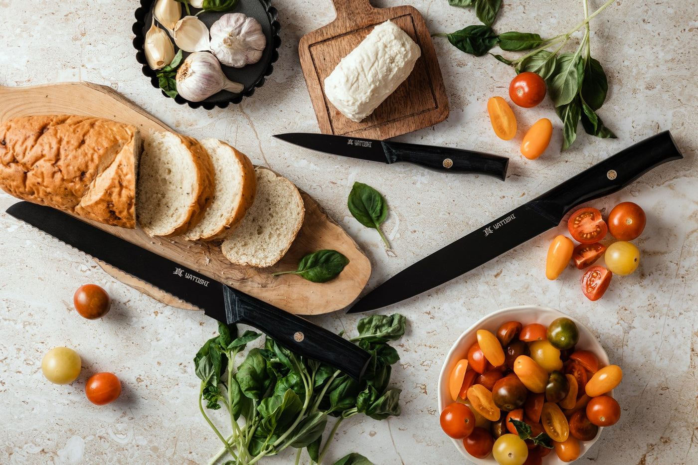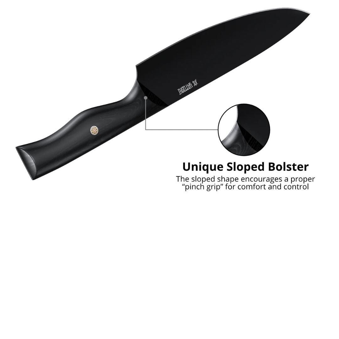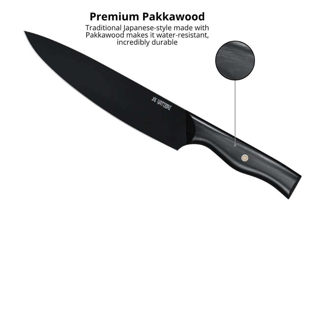 Our Onyx Black knife sets are crafted from premium high-carbon steel (7Cr17) and finished with a sleek titanium coating for striking looks and unmatched durability. The 0.6–0.75% carbon content makes these blades twice as tough as typical kitchen knives, while the titanium layer enhances corrosion resistance and keeps your knives looking flawless.