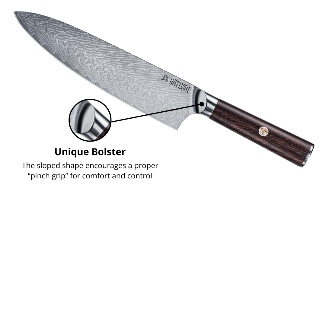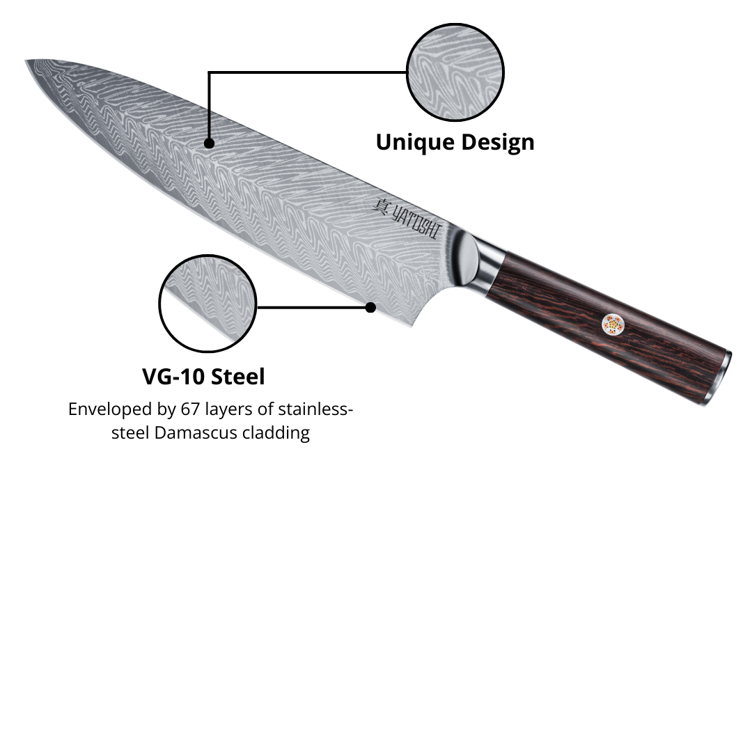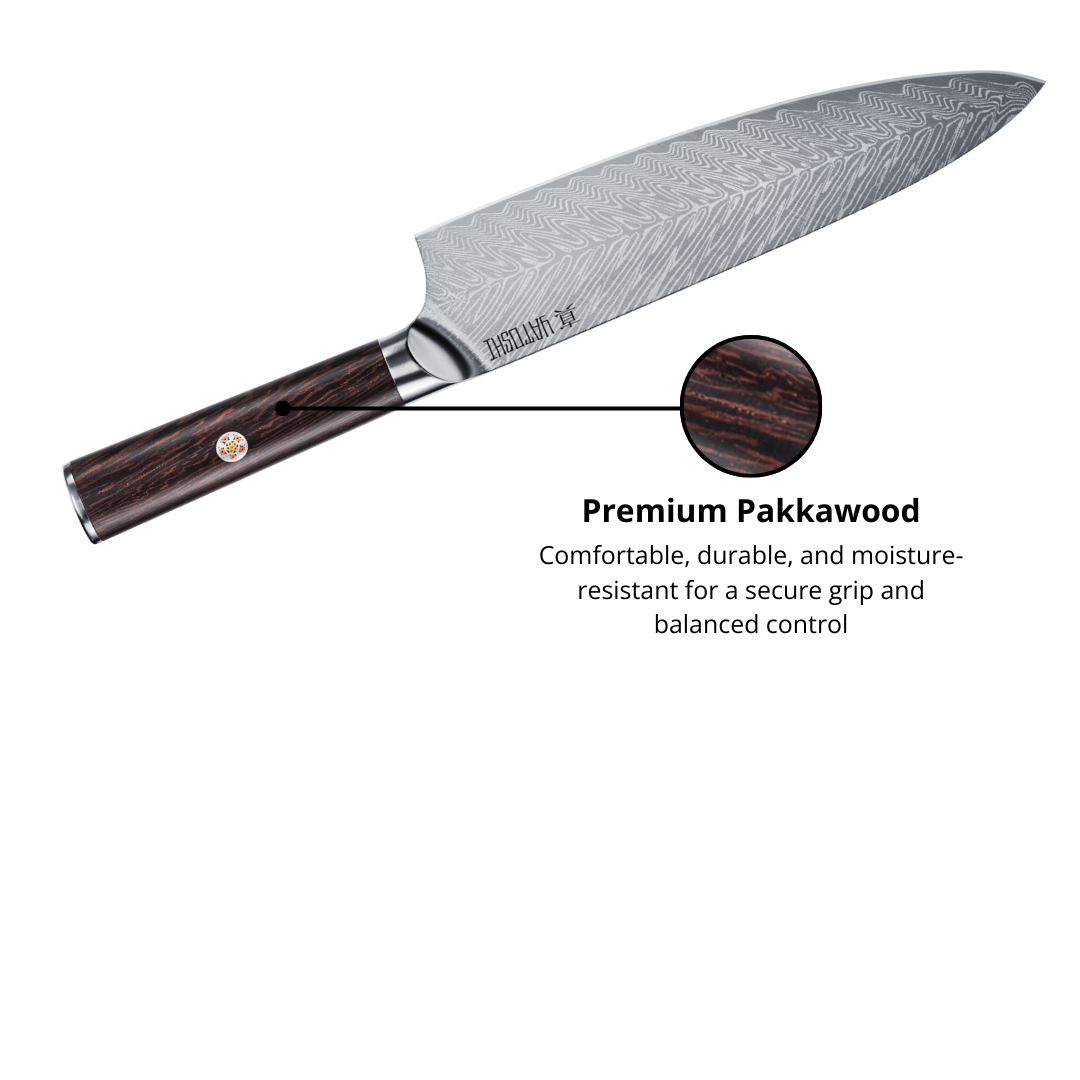 This knife set combines premium craftsmanship with modern functionality. Each blade features a VG-10 cutting core surrounded by 67 layers of stainless-steel Damascus cladding, delivering exceptional sharpness, edge retention, and durability. With a Rockwell Hardness of 60–61 and a meticulously hand-shaped Japanese double-bevel angled at 16° per side, the knives offer precise, effortless cutting performance. The handles feature a concealed-tang design that balances strength, comfort, and contemporary style, while also being low-maintenance and moisture-resistant. The set is housed in a sleek Walnut (Black & Brown) or Acacia (Olive) wood magnetic block, lined with powerful magnets to organize and display each knife securely. Finished with a non-slip base, the block’s clean, minimalist design brings both elegance and stability to any kitchen.