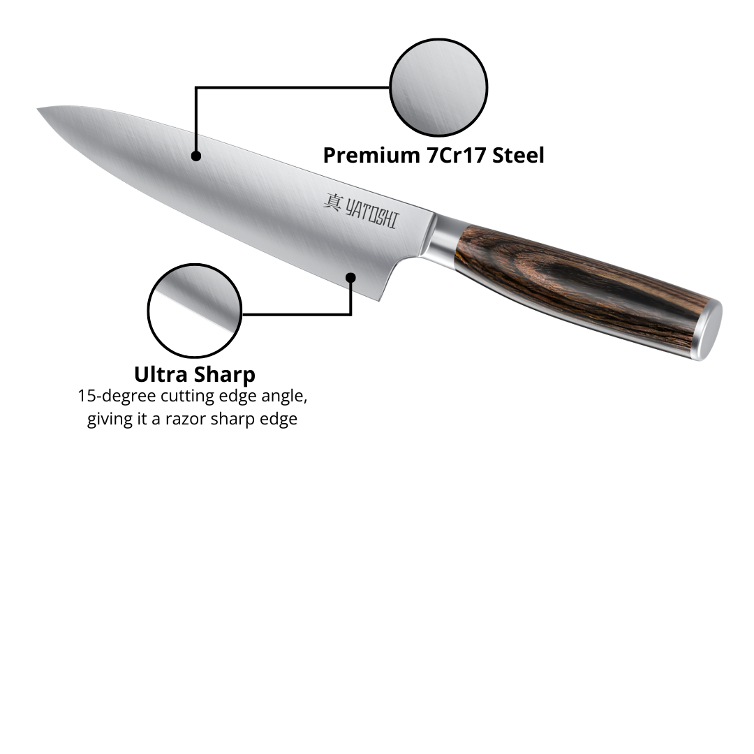 Our knives are crafted from premium high-carbon steel (7Cr17), delivering razor-sharp precision and professional-level quality right in your kitchen. With 0.6–0.75% carbon content, these blades are twice as tough as typical kitchen knives, ensuring lasting strength and reliability.